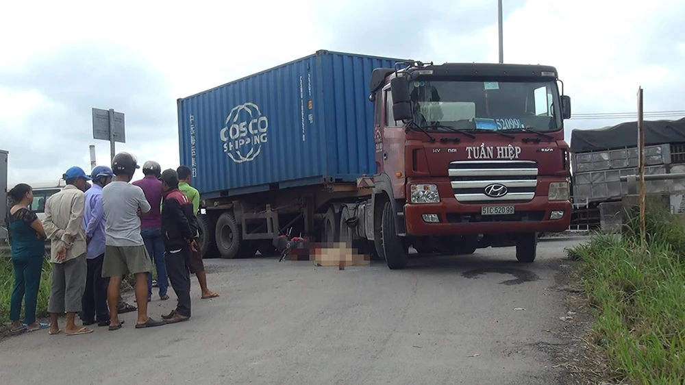 Nam thanh niên điều khiển xe máy va chạm với container và bị cán tử vong. Ảnh: H.Tâm