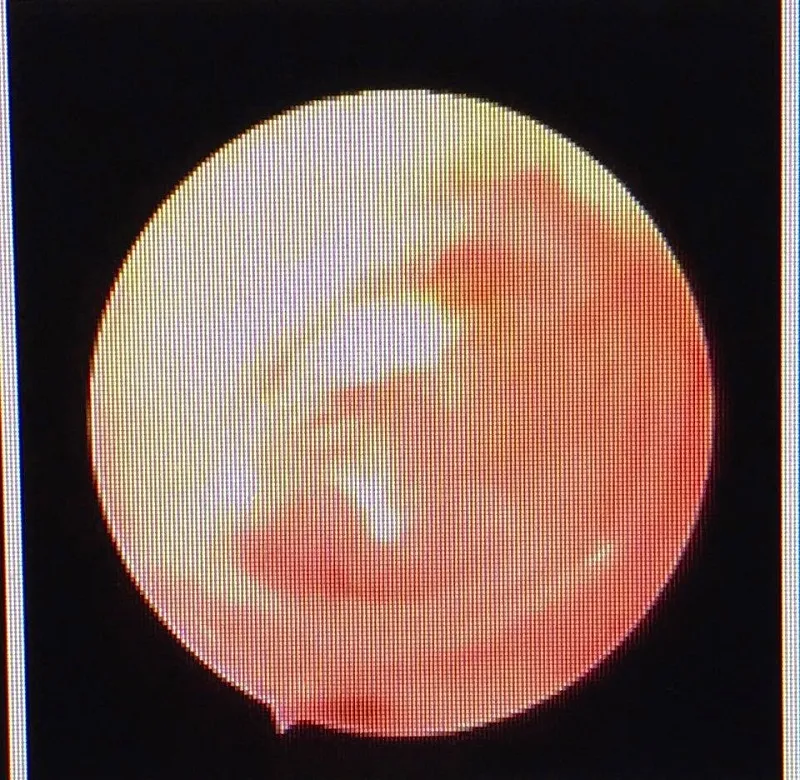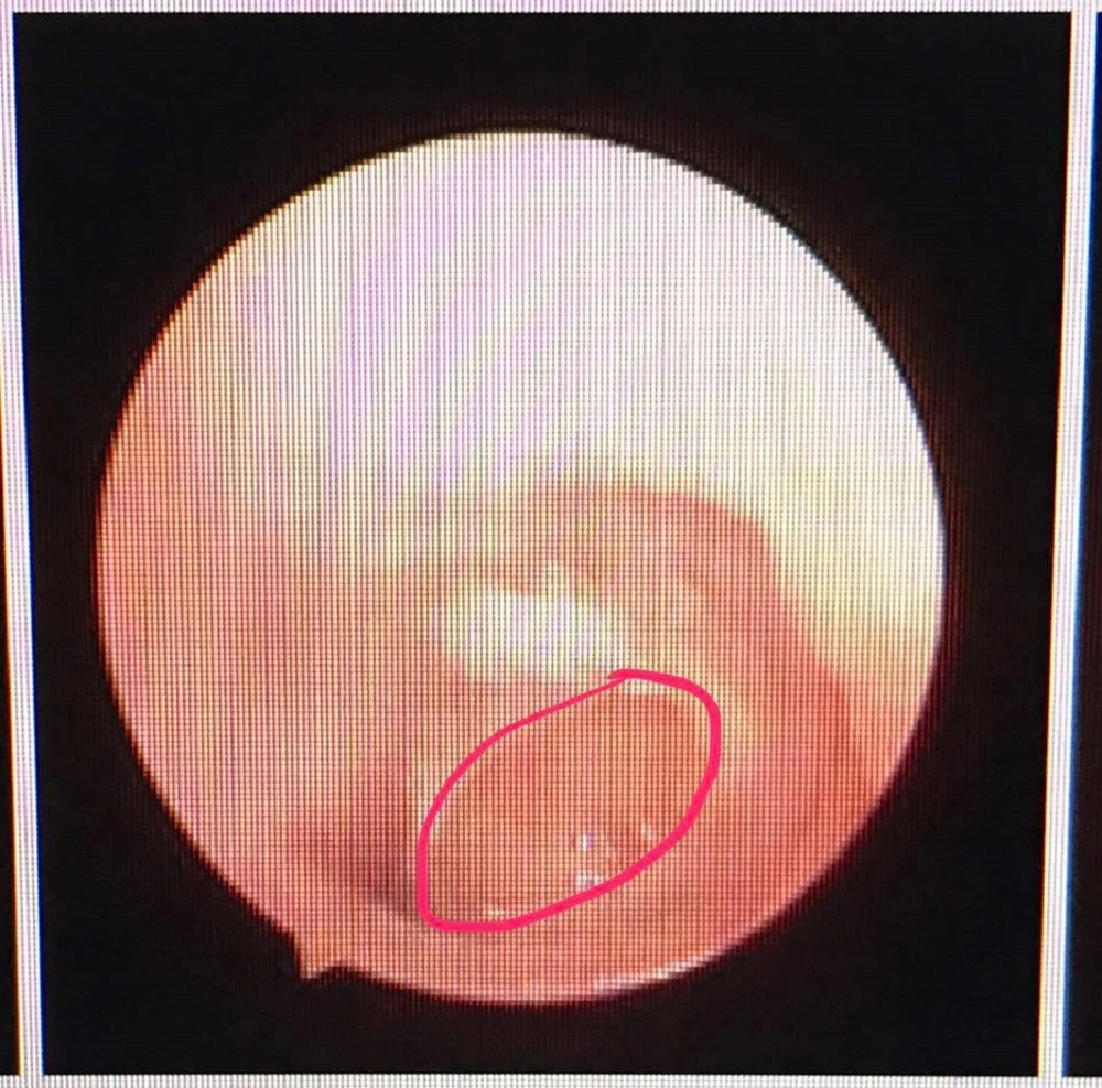 Bệnh nhân được nội soi phát hiện màng nhĩ thủng rộng 1/2 màng căng, có mãng vôi hoá, X-quang xương chũm còn thông bào tốt. Sau thăm khám bệnh nhân được chỉ định vá nhĩ qua gây mê nhưng không đủ điều kiện kinh phí mổ.