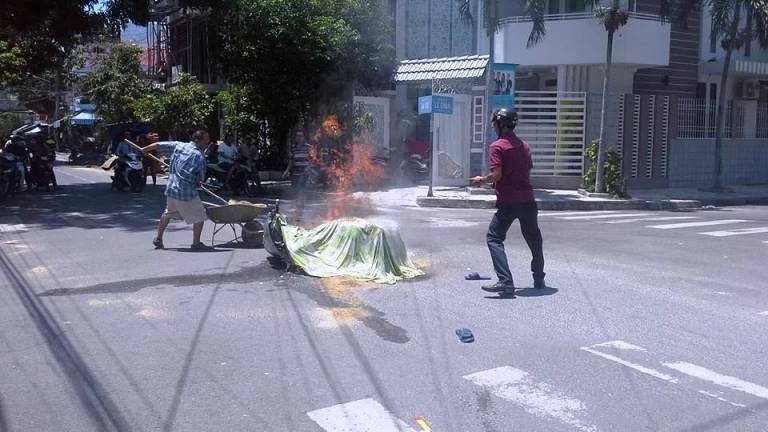 Theo các nhân chứng, hai xe máy đi cùng chiều vượt nhau dẫn đến va quẹt, làm người nữ điều khiển xe Attila ngã xuống đường, chiếc xe cà xuống mặt đường và bốc cháy.