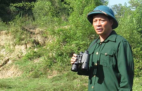 Ông Tú đang trên đường vào rừng với chiếc ống nhòm là vật bất ly thân để đếm những con voọc Hà Tĩnh. Ảnh: MINH QUÊ