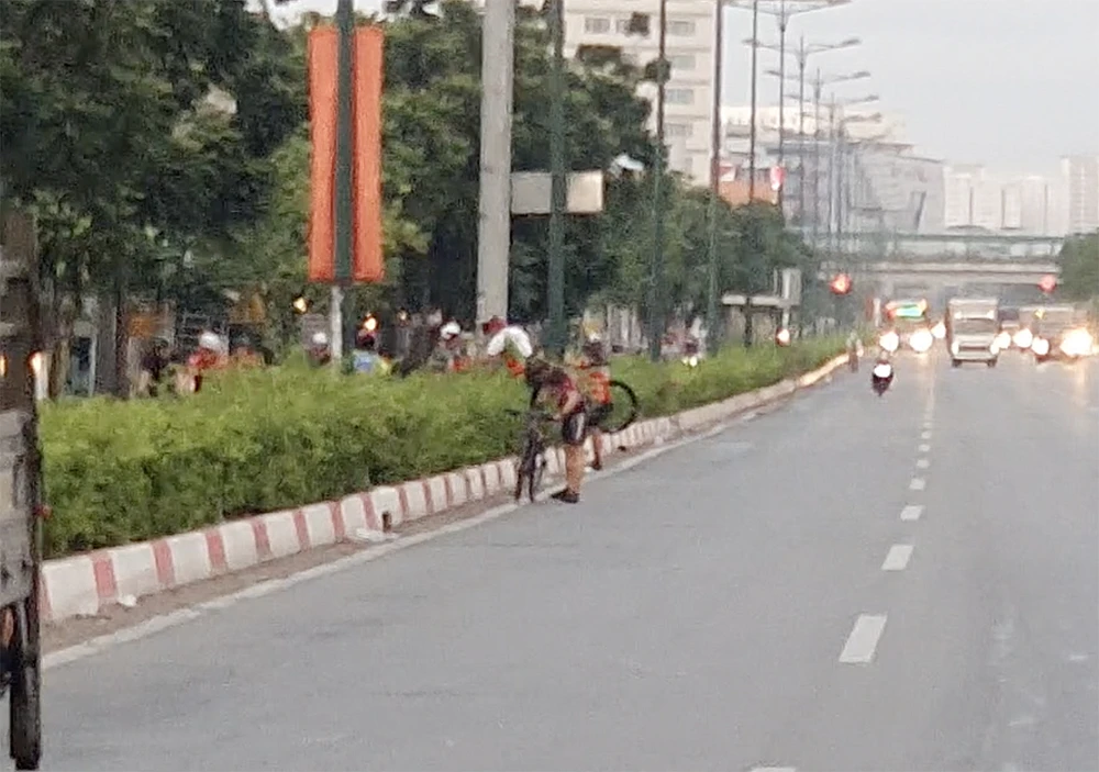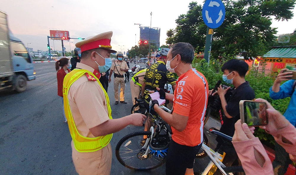 5 giờ 20, tổ công tác chốt chặn ở làn đường ô tô đoạn giao giữa đường Phạm Văn Đồng và đường Hiệp Bình (phường Hiệp Bình Chánh). Tại đây, CSGT đã xử lý nhiều trường hợp người đi xe đạp thể thao vi phạm pháp luật về giao thông đường bộ trên đường Phạm Văn Đồng.