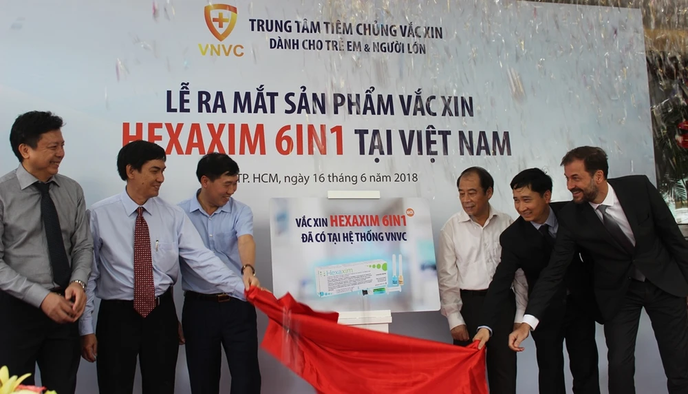 Các đại biểu thực hiện nghi lễ ra mắt vaccine Hexaxim 6 trong 1 tại Trung tâm VNVC. Ảnh: HL