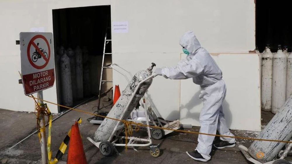 Một nhân viên y tế đẩy bình oxygen y tế đến khu vực điều trị các bệnh nhân COVID-19 ở Jakarta (Indonesia). Ảnh: REUTERS