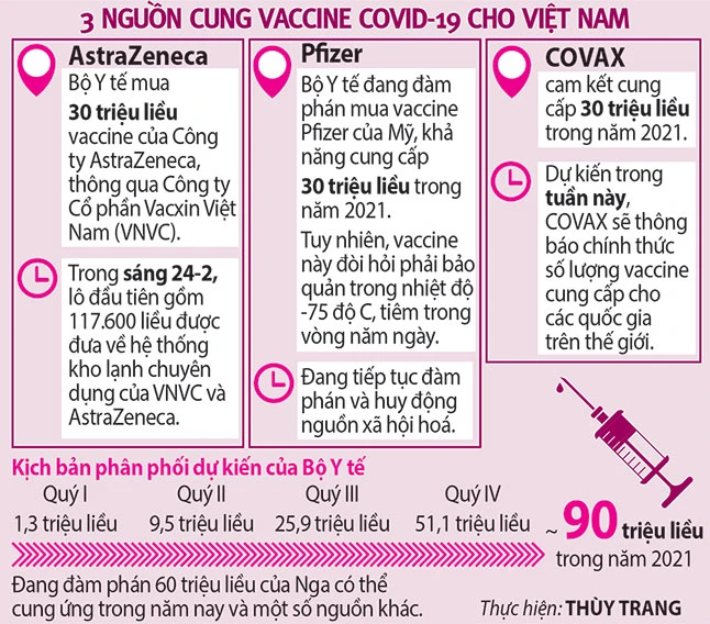 Nguồn thứ nhất, Bộ Y tế đã đàm phán với chương trình Covax (do Tổ chức Y tế Thế giới (WHO) khởi xướng) cam kết cung cấp cho VN 30 triệu liều trong năm 2021. Dự kiến trong tuần này, Covax sẽ thông báo chính thức số lượng vaccine cung cấp cho các quốc gia trên thế giới.