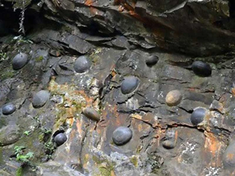Một cách khó hiểu, từ vách đá này những viên đá hình trứng trơn nhẵn cứ dần nhô lên rồi rơi xuống suối sau mỗi 30 năm.