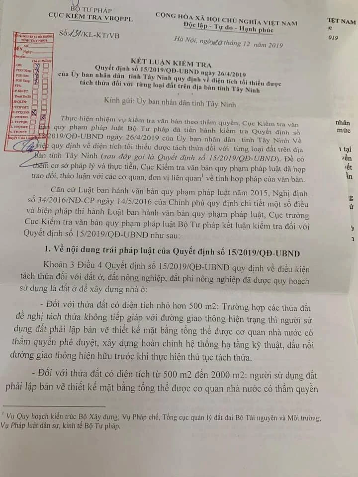 Ngày 20-12-2019, Cục Kiểm tra văn bản quy phạm pháp luật ban hành kết luận kiểm tra đối với Quyết định số 15/2019/QĐ-UBND ngày 26-4-2019 của UBND tỉnh Tây Ninh quy định về diện tích tối thiểu được tách thửa đối với từng loại đất trên địa bàn tỉnh Tây Ninh.