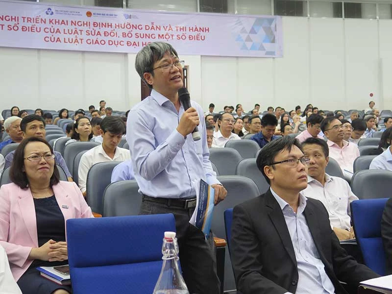 PGS-TS Nguyễn Tiến Công, Chủ tịch Hội đồng trường, Trường ĐH Sư phạm TP.HCM, đặt vấn đề: Hội đồng trường hiện được thành lập theo quyết định ngày 6-12-2019 nhưng nhiệm kỳ 2018-2025. Thời điểm tính nhiệm kỳ của hội đồng trường được tính thế nào, có theo nhiệm kỳ của hiệu trưởng? “Theo tôi hiểu, nhiệm kỳ hội đồng trường theo nhiệm kỳ hiệu trưởng có đúng không? Hội đồng trường chúng tôi đã thành lập theo đúng Luật Giáo dục ĐH và trường đã có hiệu trưởng thì có cần làm lại nhân sự hiệu trưởng hay không” - ông Công thắc mắc.