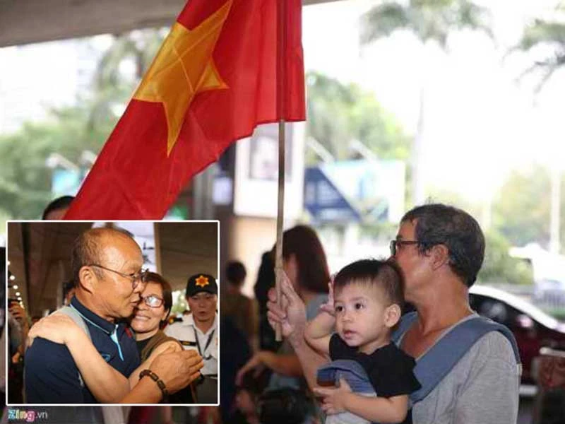 Cổ động viên an ủi thầy Park, trong đó có người mang cả cờ ra sân bay để đón đội U-23 Việt Nam trở về. Ảnh: plo.vn