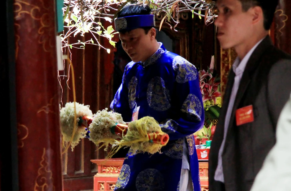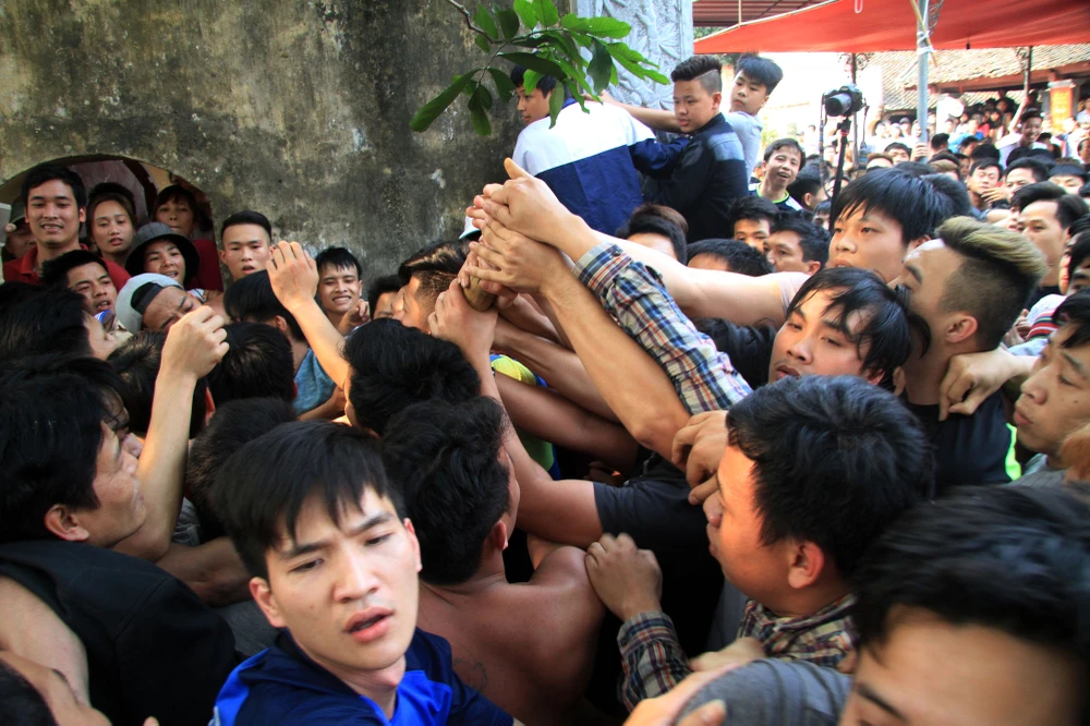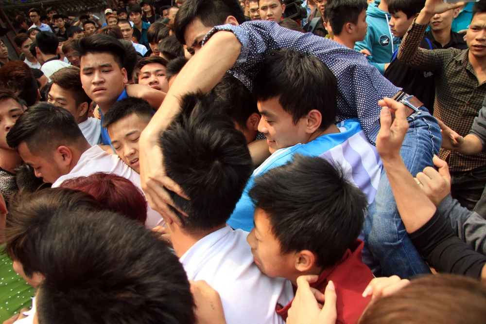 Bông được các thanh niên giằng co quyết liệt, nhiều người chỉ cần chạm vào để lấy may.