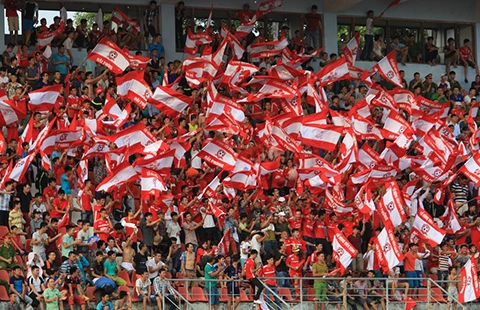 Khán giả Hải Phòng hết mình với đội bóng nhưng cũng sẵn sàng đòi ban tổ chức làm cho ra lẽ trước biểu hiện tiêu cực, nhường điểm của đội nhà. Tiếc là ban tổ chức vẫn “giả điếc” và ngó lơ. Ảnh: QUANG THẮNG