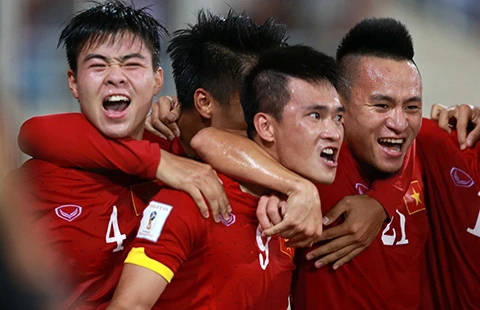 Hình ảnh các cầu thủ Việt Nam mạnh mẽ trên sân Mỹ Đình trong trận hòa Iraq 1-1. Ảnh: QUANG THẮNG