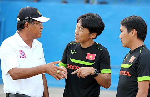 HLV Miura (giữa) nhận lời góp ý từ HLV Trần Bình Sự của đội Đồng Nai. Ảnh: CT