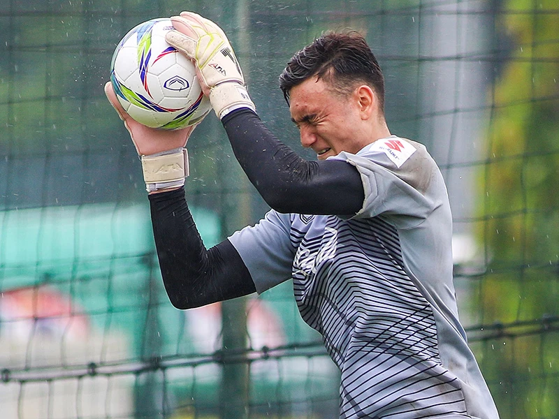 Thủ môn Văn Lâm nỗ lực trên sân tập. Ảnh: HUY PHẠM