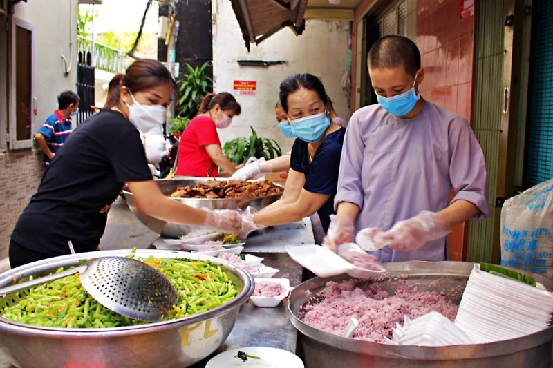 Tăng ni, Phật tử nấu cơm tại chùa Tường Nguyên (quận 4). Ảnh: NGỌC LÀI