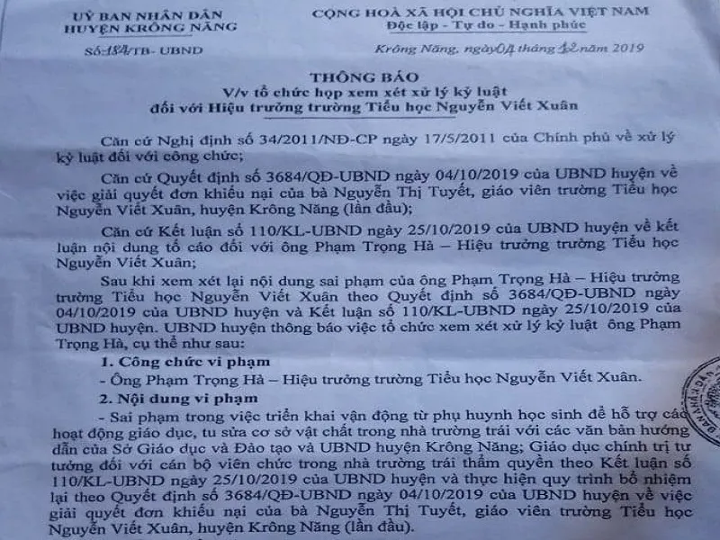 Nội dung công văn thông báo của UBND huyện Krông Năng nêu rõ, ông Phạm Trọng Hà, Hiệu trưởng Trường Tiểu học Nguyễn Viết Xuân, có sai phạm trong việc triển khai vận động từ phụ huynh học sinh để hỗ trợ các hoạt động giáo dục, tu sửa cơ sở vật chất trong nhà trường trái với các văn bản hướng dẫn của Sở GD&ĐT và UBND huyện Krông Năng.