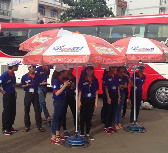 Sinh viên các trường đại học, cao đẳng ra quân tiếp sức mùa thi tại Bến xe miền Đông. Ảnh: P.Điền