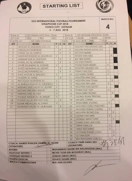 Bước vào trận đấu với U-23 Oman, HLV Park Hang-seo của U-23 Việt Nam đã thay toàn bộ đội hình so với trận thắng 2-1 trước Palestine.