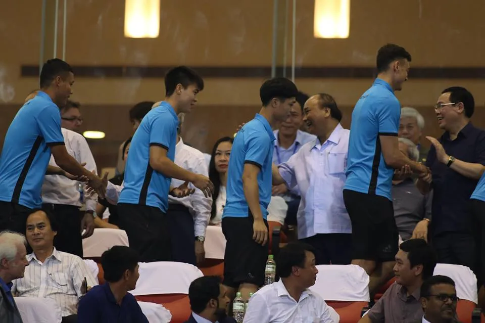 Thủ tướng Chính phủ Nguyễn Xuân Phúc có mặt trên sân Mỹ Đình theo dõi trận đấu. Thủ tướng bắt tay Văn Lâm, Công Phượng, Duy Mạnh, Anh Đức, bốn cầu thủ không có tên trong danh sách thi đấu hôm nay.