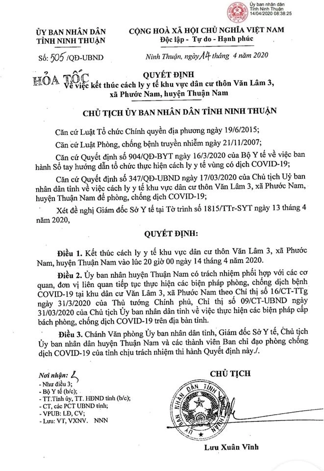 Theo nguồn tin từ UBND huyện Thuận Nam thì chiều 14-3, tỉnh Ninh Thuận chính thức công bố quyết định hết thời gian khoanh vùng và cách ly y tế đối với thôn Văn Lâm 3 xã Phước Nam, huyện Thuận Nam. Sau đó, đúng 20 giờ cùng ngày thôn Văn Lâm 3 sẽ được dỡ bỏ việc khoanh vùng, phong tỏa, cách ly sau 28 ngày theo quy định.