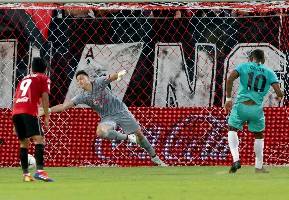 Văn Lâm đoán đúng hướng nhưng không thể ngăn cản được pha dứt điểm từ chấm 11m của Souza