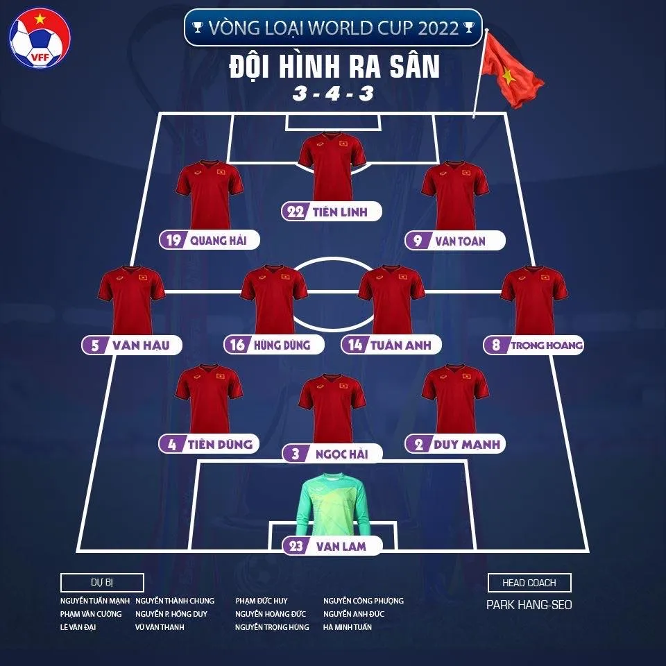 Việt Nam: Văn Lâm, Duy Mạnh, Ngọc Hải, Tiến Dũng, Văn Hậu, Trọng Hoàng, Tuấn Anh, Hùng Dũng, Quang Hải, Văn Toàn, Tiến Linh.