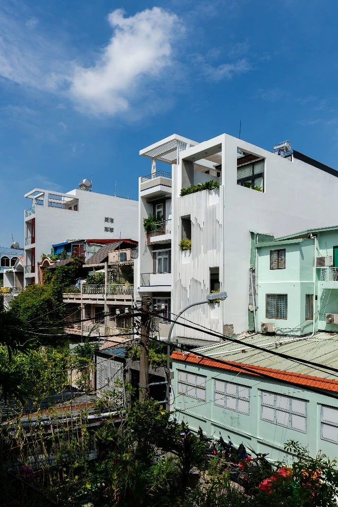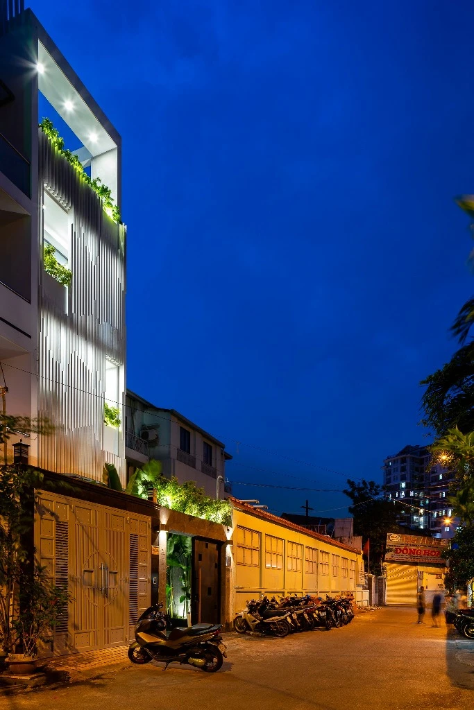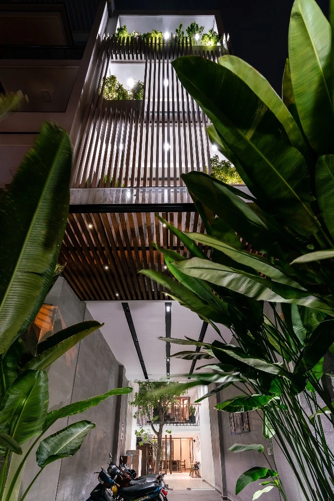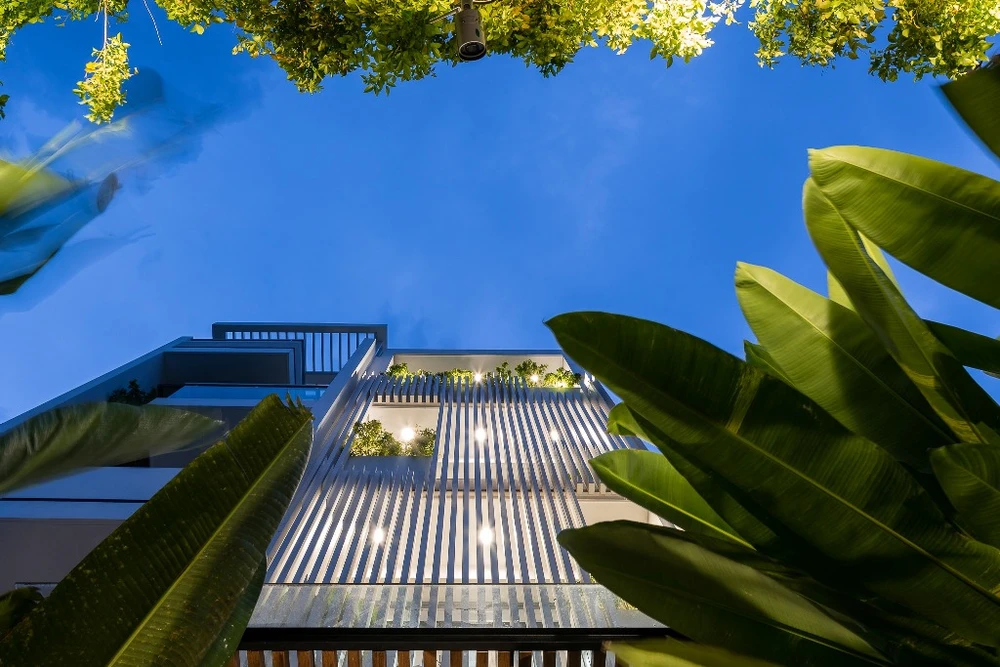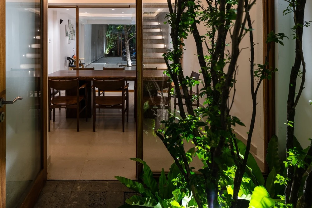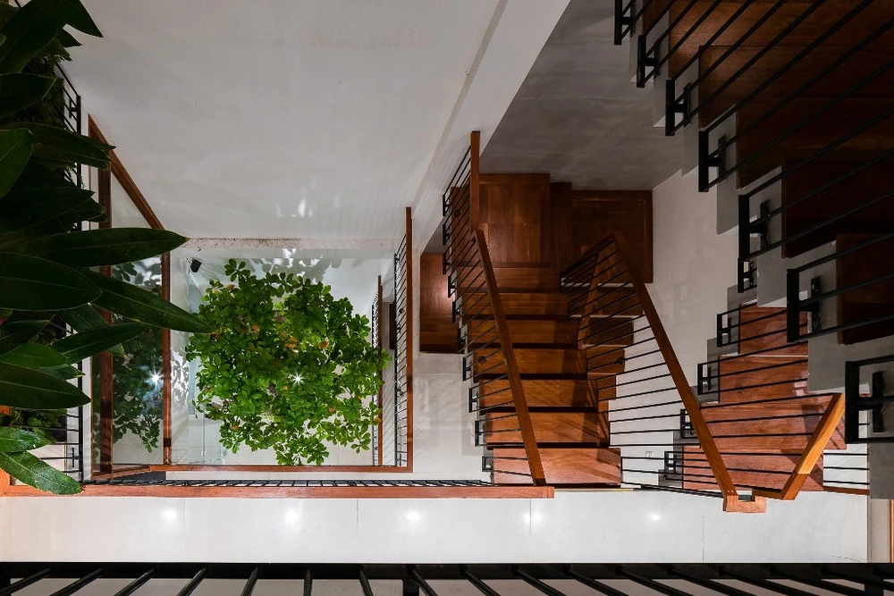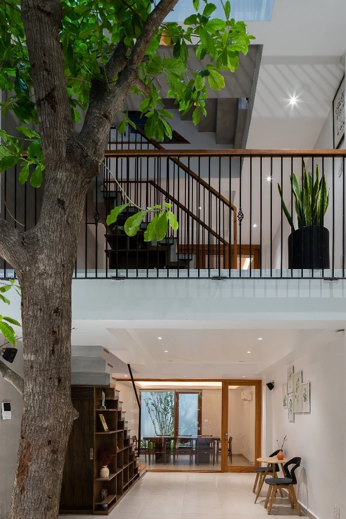Từ đó, nhóm KTS tận dụng chiều dài của khu đất dành một diện tích lớn cho khoảng giếng trời. Đây chính là không gian liên kết các thành phần của ngôi nhà, cân bằng giữa yếu tố tĩnh-động, đối lưu không khí, ánh sáng và thiên nhiên.