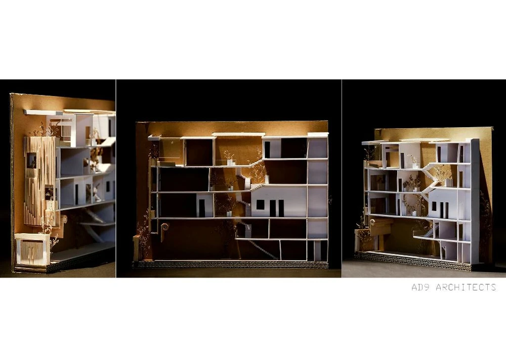 Nhóm KTS chia sẻ với PV, AD9 rất quen với những dự án nhà phố tại TP.HCM. Tuy nhiên, công trình này có điểm khó là chiều dài có phần lấn át chiều rộng. Nhiệm vụ của nhóm là tạo ra không gian có tính tương tác và giao tiếp thuận lợi giữa các thành viên trong gia đình.