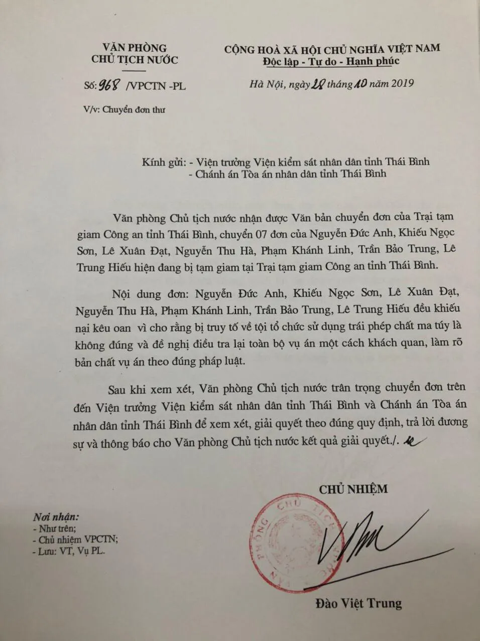 Theo đó, Văn phòng Chủ tịch nước đã nhận được đơn của bảy bị can Phạm Khánh Linh, Nguyễn Đức Anh, Nguyễn Hải Nam, Lê Trung Hiếu, Lê Xuân Đạt, Trần Ngọc Trung, Trần Bảo Trung, Khiếu Ngọc Sơn và Nguyễn Thu Hà do Trại tạm giam Công an tỉnh Thái Bình chuyển đến.
