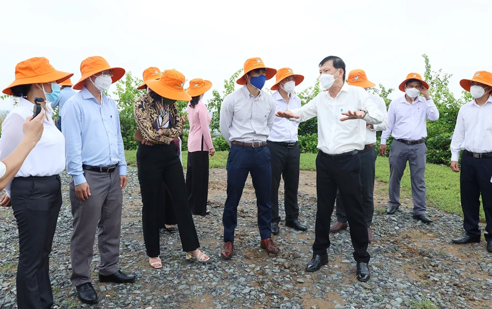 Ông Dương Văn Cường (người không đội nón) đang thuyết minh cho đoàn thẩm định về quy trình tiếp nhận chất thải ở Khu Liên hợp xử lý chất thải Đa Phước
