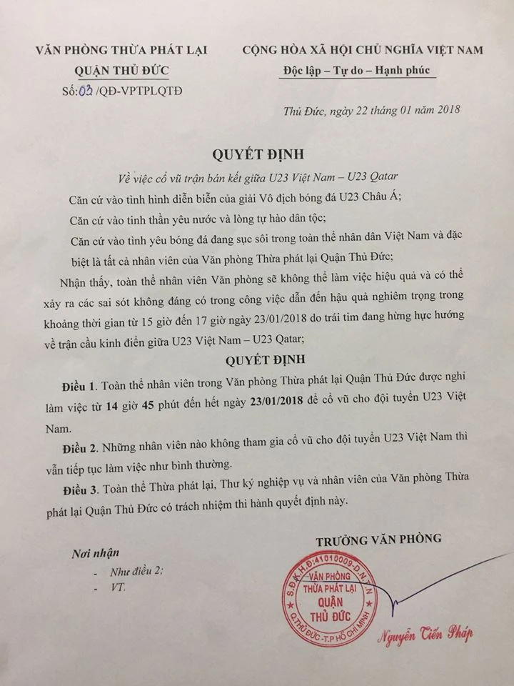 Ngày 22-1 trưởng Văn phòng thừa phát lại quận Thủ Đức, TP.HCM đã ra quyết định cho nhân viên của văn phòng nghỉ làm việc trong chiều 23-1 để cổ vũ cho đội tuyển U23 Việt Nam trong trận đấu bán kết với đội U23 Quatar (trong khuôn khổ giải U-23 châu Á).
