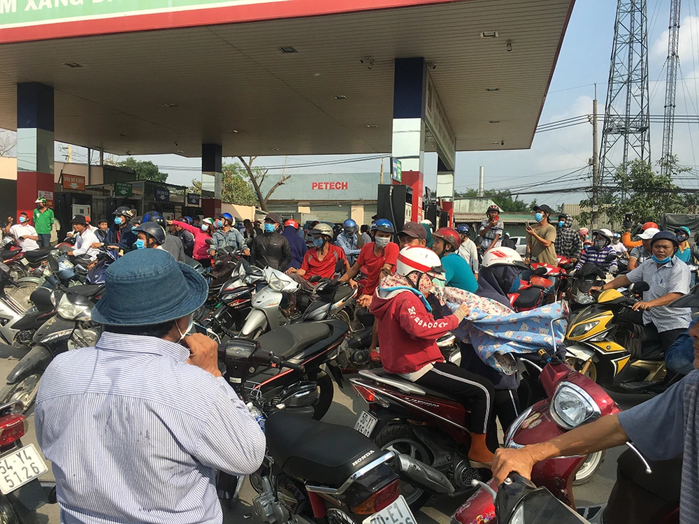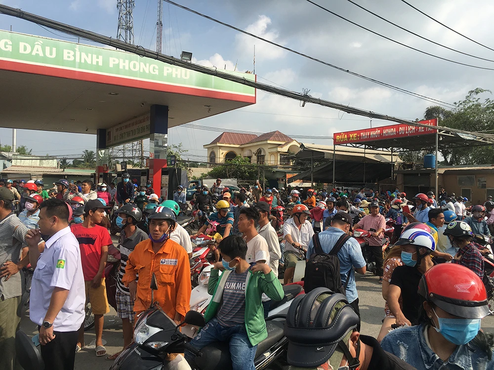 Hàng trăm xe gắn máy của người dân tập trung trước khu vực cây xăng Bình Phong Phú. Ảnh: NY