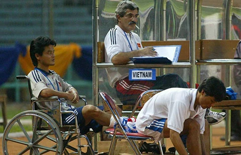 Văn Sỹ ngồi bên khu kỹ thuật trong chiến thắng Malaysia 2-1 đoạt HCĐ Tiger Cup 2002. Ảnh: QUANG NHỰT