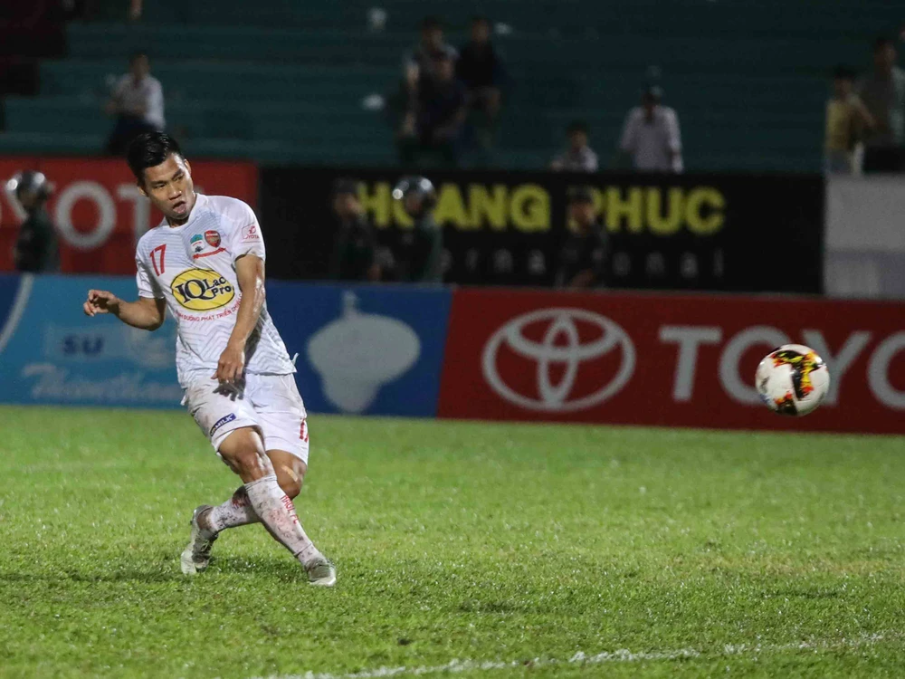 Văn Thanh sút phạt mở điểm và hoàn tất cú đúp từ một cú sút góc hẹp. Ảnh: ANH MINH