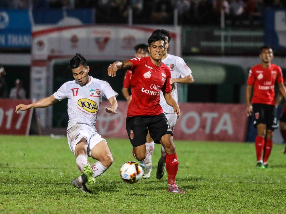 Công Phượng đi bóng trong sự truy cản của cầu thủ Long An.