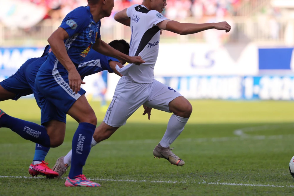 Pha đột phá của Văn Toàn khiến Mạnh Toàn phải phạm lỗi trong vùng 16m50. Ảnh: ANH ĐỒNG