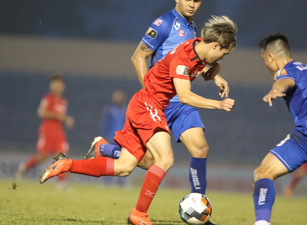 Pha bứt tốc độ giúp tiền đạo HA Gia Lai Văn Toàn tạo nên "siêu phẩm" vào lưới Than Quảng Ninh tại vòng 4 V-League. ẢNH: VPF