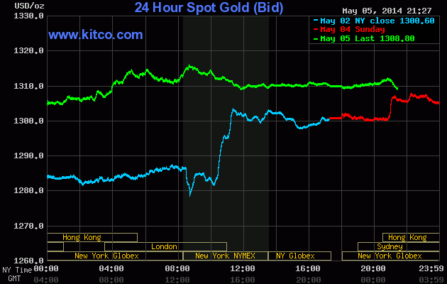 Kết thúc phiên giao dịch ngày thứ Hai, hợp đồng vàng giao tháng 6 trên bộ phận Comex của sàn Nymex tăng 6.40 USD/oz (tương ứng 0.5%) lên 1,309.30 USD/oz, mức cao nhất kể từ ngày 14/04. Trước đó, kim loại quý lên tới 1,315.80 USD/oz trong giao dịch điện tử.