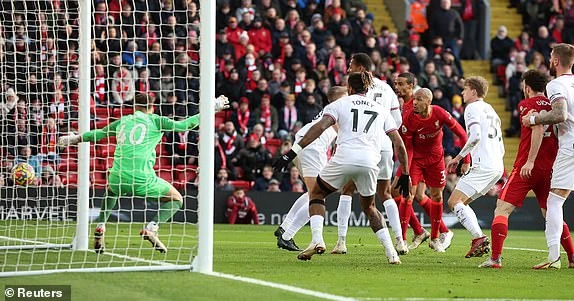 Đội bóng của Jurgen Klopp rất “chăm” tạt bóng vào trong chứ không chơi phối hợp nhỏ. Cơ hội rõ ràng nhất của Liverpool cũng đến từ một pha bóng như vậy khi từ quả đá phạt góc, trung vệ Van Dijk lên tham gia tấn công dứt điểm nhưng hậu vệ Brentford đã kịp thời phá bóng ngay trên vạch vôi.