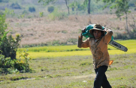 Một chàng trai M’Nông ở vùng Lak nhắm thẳng dãy Yang Lac để lên xẻ gỗ với chiếc cưa máy hiện đại của Nhật. Cứ như thế, rừng ngày càng lùi vào dĩ vãng. Ảnh: N.H.T