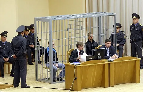 Trong phiên tòa xét xử tội phạm hình sự tại Belarus, bị cáo bị nhốt trong lồng sắt để đảm bảo an ninh tại phiên tòa. Ảnh: EPA