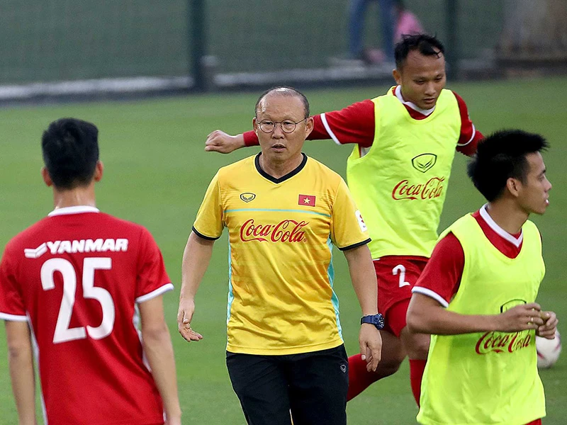 HLV Park Hang-seo đưa các cầu thủ trở lại mặt đất và bắt đầu tập trung cho trận tiếp theo với Myanmar trên sân đối phương. Ảnh: NGỌC DUNG