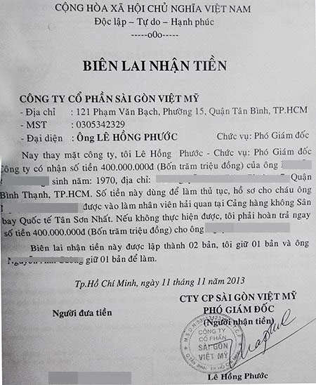 Nghe vậy, anh C. xin việc cho bốn người và chuyển trước 400 triệu đồng vào tài khoản của Phước. Nhận tiền, Phước ký biên nhận đưa cho anh C. Khoảng một tuần sau, Phước đưa bốn bộ hồ sơ tuyển dụng có mộc đỏ “Công ty Cổ phần Đào tạo Nghiệp vụ Hàng không Việt Nam” làm anh C. càng tin tưởng.