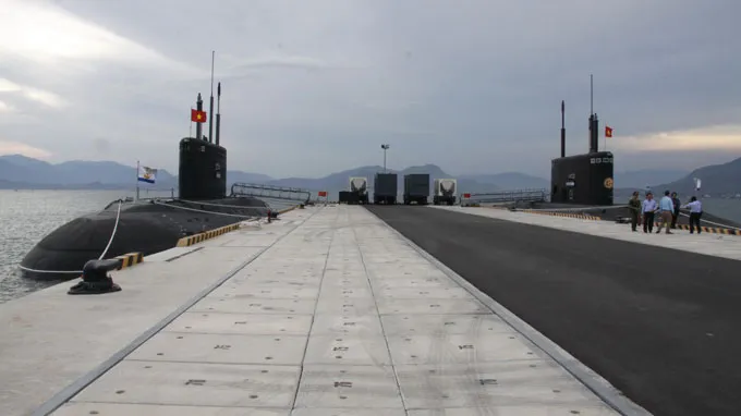 Cặp sát mạn phải cầu cảng quân sự Cam Ranh, chiếc tàu ngầm Kilo 636 mang phiên hiệu HQ-183 TP.HCM đang trong tình trạng nửa nổi nửa chìm trên mặt biển.