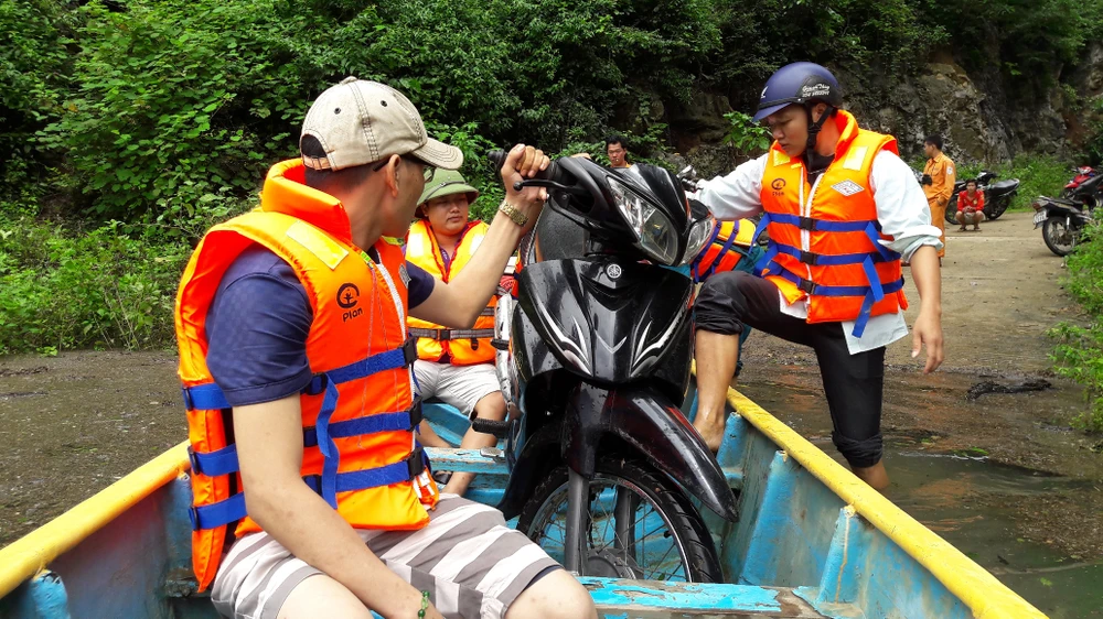 Tiếp tục dùng thuyền nhỏ vượt qua dòng nước lũ.
