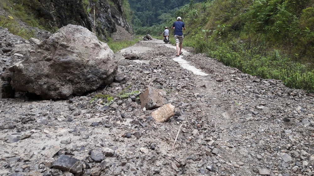 Đường vào bản Ón bị sạt lở, đất đá.