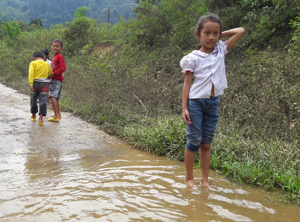 Những đứa trẻ bản Rục nghịch nước lũ.
