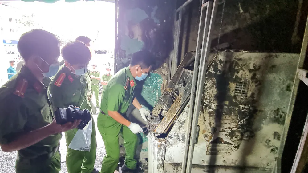 Kết quả khám nghiệm hiện trường cho thấy đám cháy xuất phát từ trụ ATM đặt phía trước ngân hàng, sau đó cháy lan vào tầng trệt và các tầng trên.