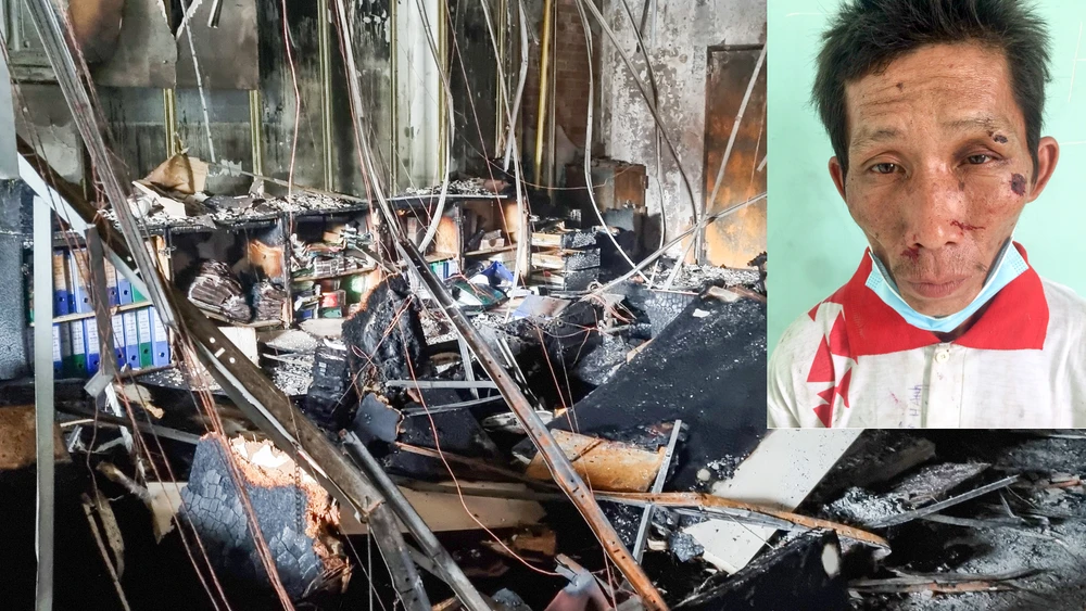 Hiện trường vụ cháy (ảnh lớn) và người đàn ông nghi phạm (ảnh nhỏ). Ảnh: VĂN VŨ