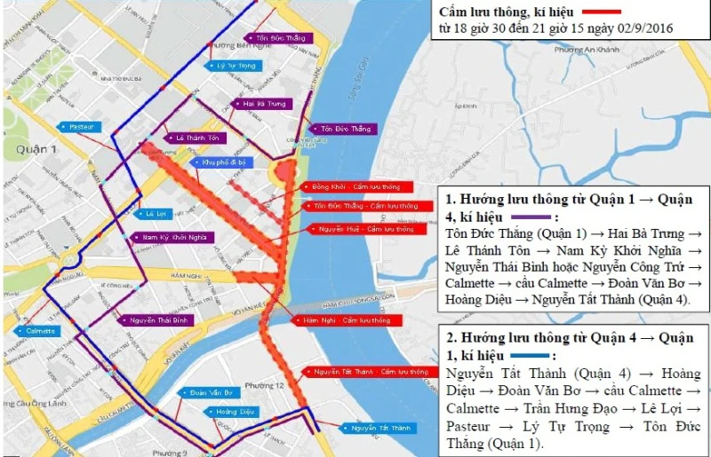 Ngoài ra, kể từ 18 giờ 30 đến 21 giờ 15 ngày 2-9, TP.HCM cấm tất cả loại phương tiện lưu thông trên các tuyến đường sau: