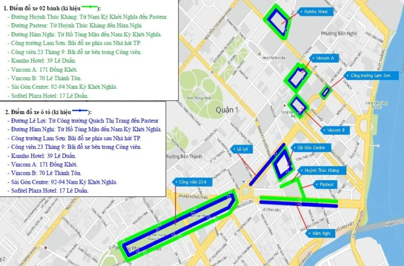 | 6 | Bãi đỗ xe bên trong các tòa nhà xung quanh khu vực | - Kumho Hotel: 39 Lê Duẩn; - Vincom A: 171 Đồng Khởi; - Vincom B: 70 Lê Thánh Tôn; - Sài Gòn Centre: 92-94 Nam Kỳ Khởi Nghĩa; - Sofitel Plaza Hotel: 17 Lê Duẩn. |